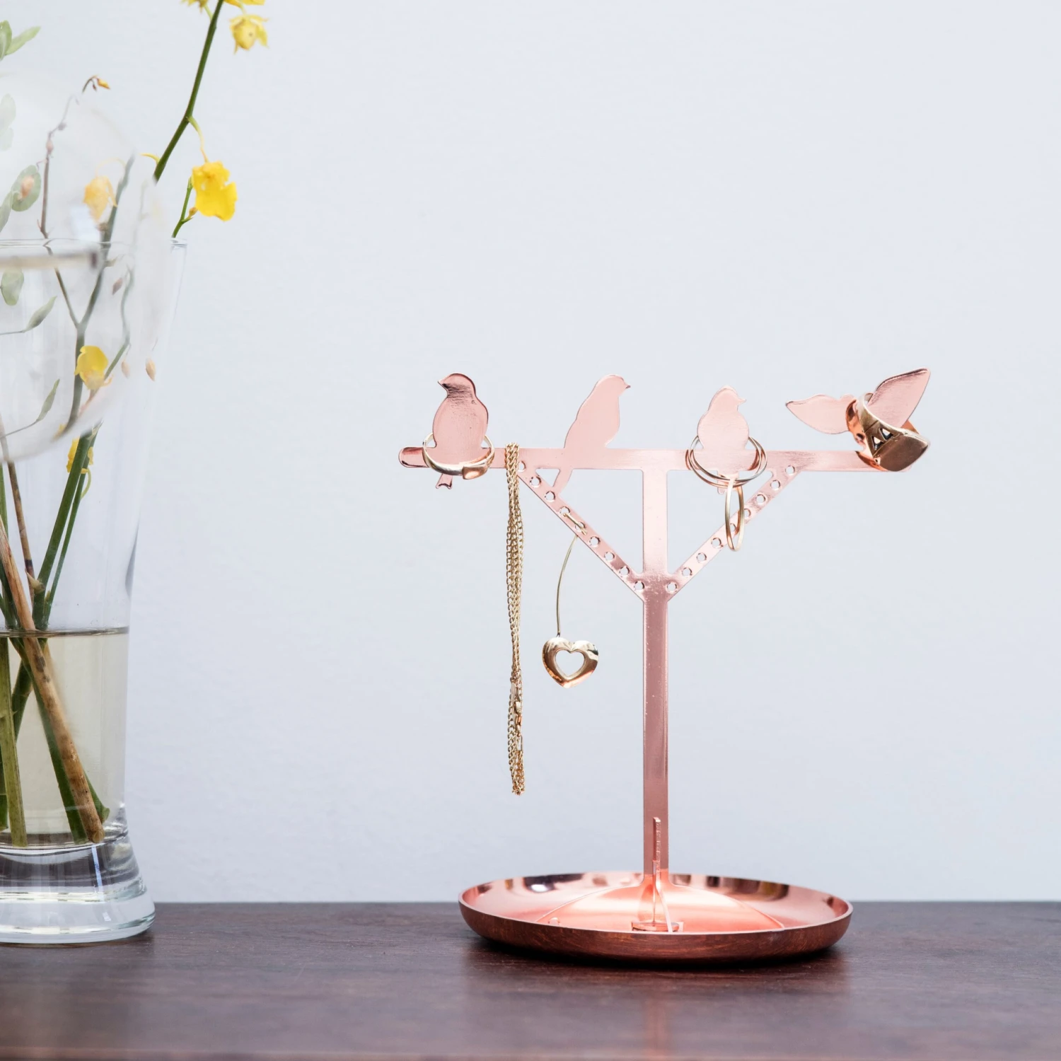 These feathered friends want to help display your necklaces and other jewelry. Simple assembly required, dish base can also hold rings, earrings, and earring backs.