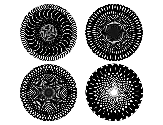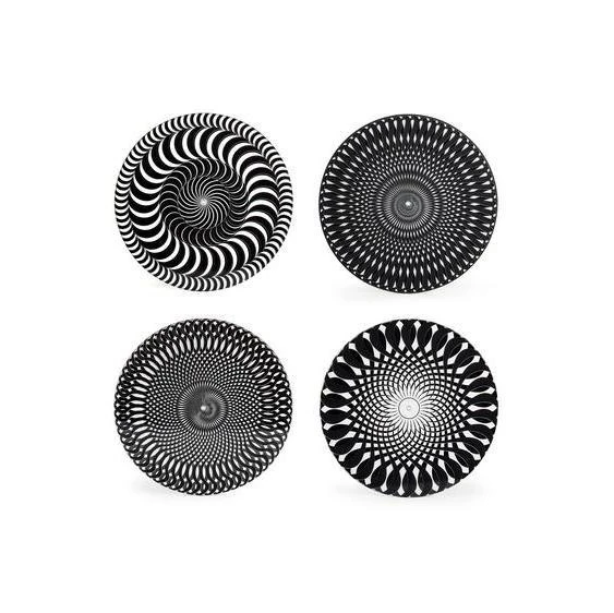 Set of 4. Entertaining guests has never been so trippy! Rotating patterns create mind bending illusions. Water-resistant with smooth, non-skid cork base. For cold drinks only.