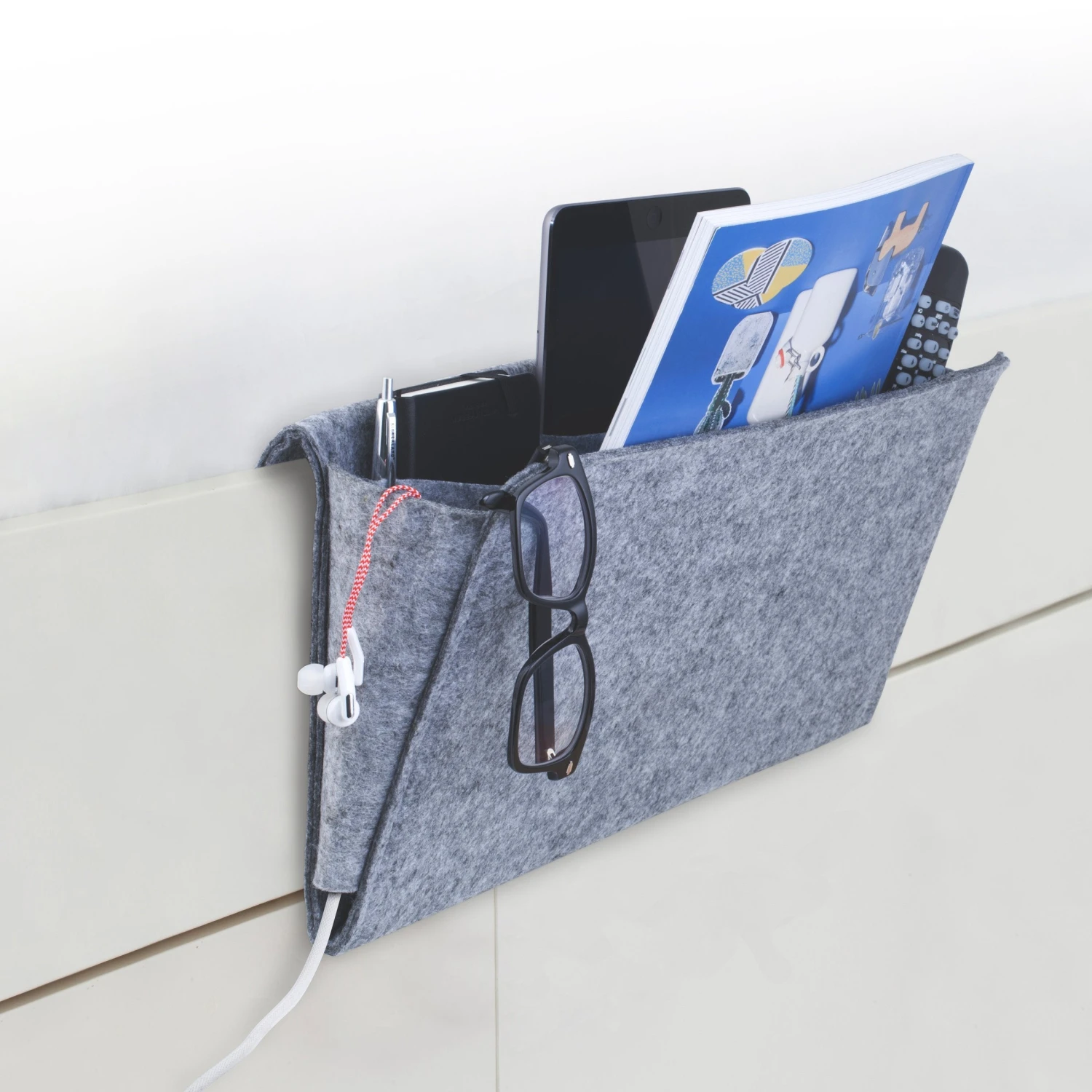 This large and secure bag is the perfect place to put all your essentials beside the bed for storage. An opening at the base for charging cable for electronic devices. Fits on any couch or bed. Winner in the Kikkerland’s 2014 Storage x Organization design project.