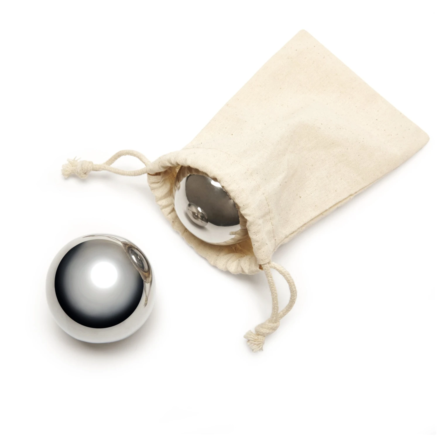 Chill your drink without watering it down with this set of 2 extra large stainless steel balls. Store in freezer. Includes cotton carrying pouch.