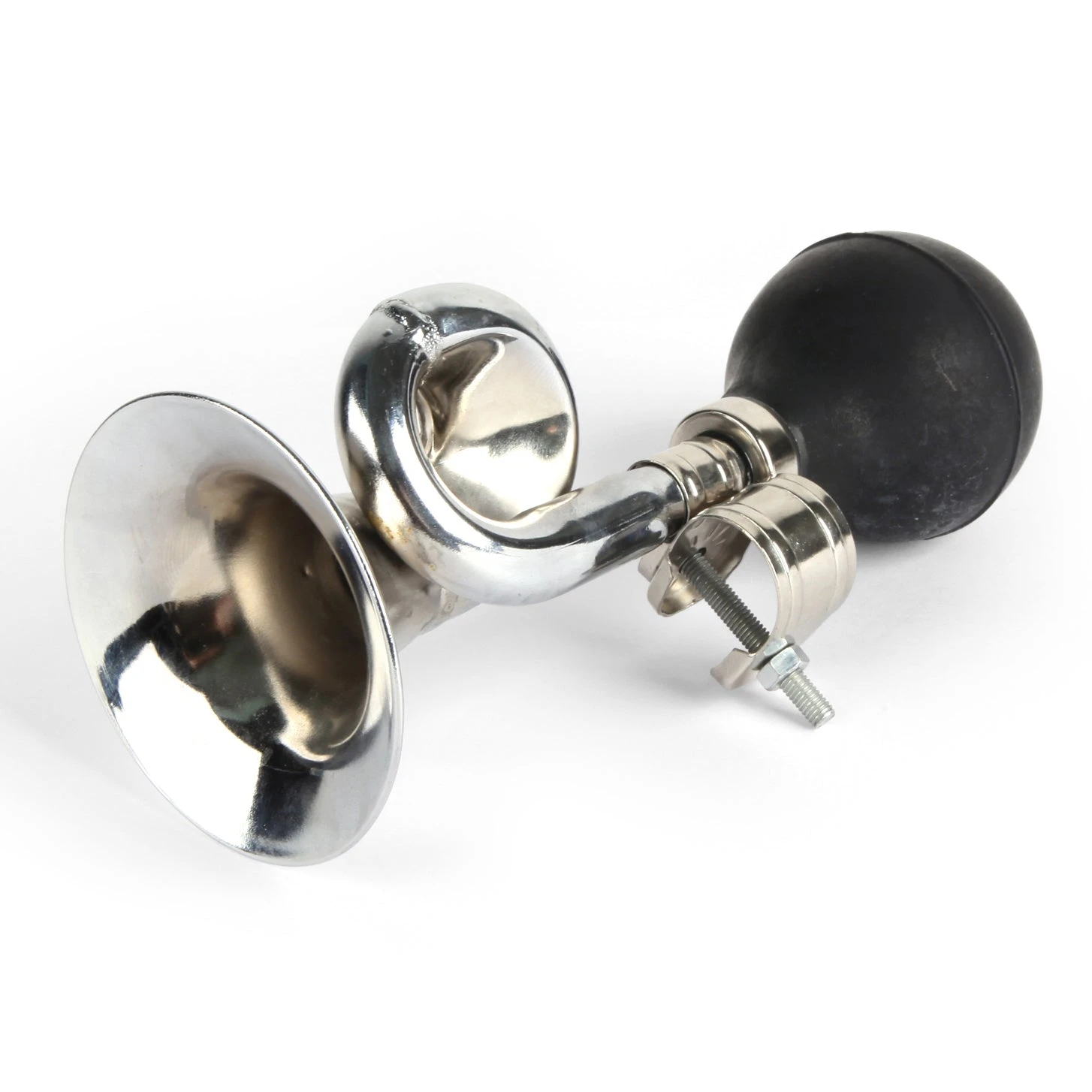 Share the road responsibly! The Bugle bike horn is an early American design with chromed steel parts, soft rubber bulb. Includes mounting kit.